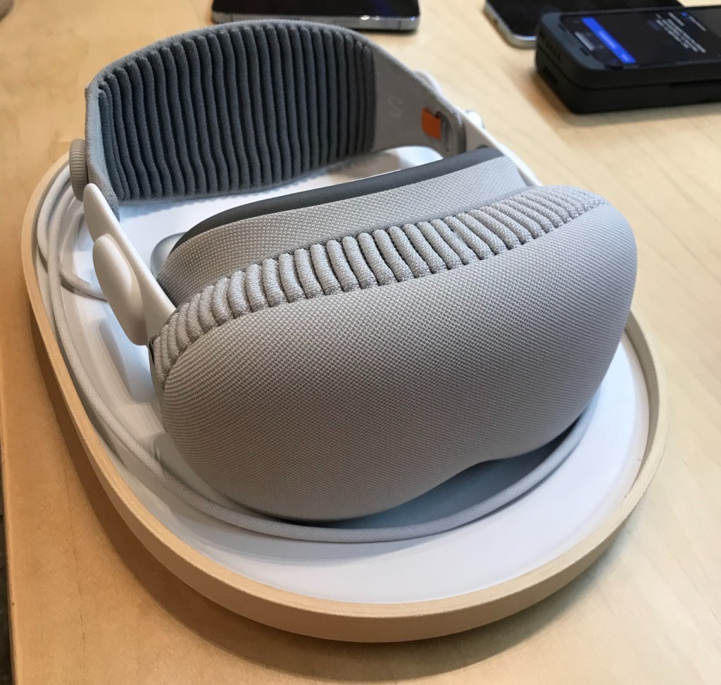 At the Apple Store, I checked in and waited for a few minutes. The employee I paired with, who was excellent, gave me a store phone to scan my face. (I’m size 21W. Whatever that is.) After talking for a bit with this employee, another came by with the Vision Pro literally served on a platter. The outer glass was protected with its cover, and a white pad was over the facial interface to make sure that my oils didn’t get on it. (I had been wondering how they would do this.)